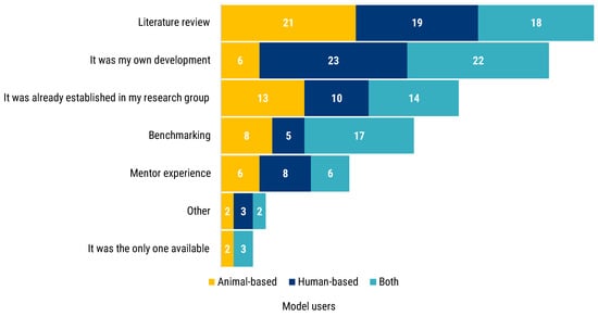 Participants were asked whether their model of choice was selected or established. The majority of answers pointed to literature review (58). Fifty-one researchers also answered that the model was self-developed, which is particularly true for human-based model users (23) and researchers who used both animal- and human-based models (22) (Figure 2). Inheritance represented the third most frequent factor for models selection: 37 respondents declared that the model in use was already established in the research group of work. Additionally, the mentor experience was reported as a factor to select the experimental model. Lastly, benchmarking is the fourth method most reported to select or to establish a model, especially for those researchers using both human- and animal-based models. Five researchers stated their chosen model to be the only one available, while seven reported to having relied on other methods to choose and select their models.