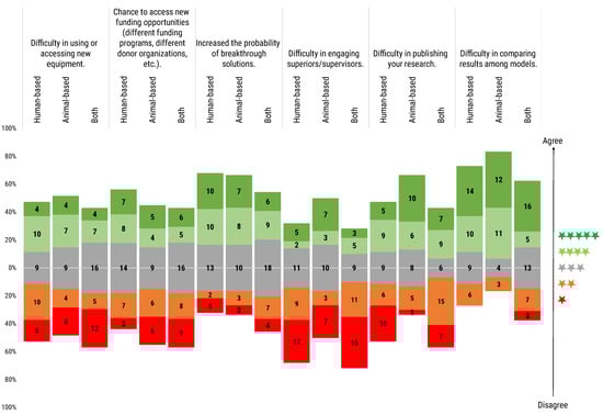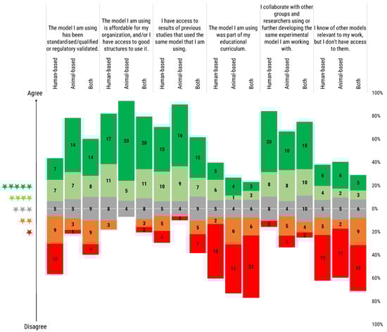 Participants were asked to rate the following statements regarding the use of models. Rating scale was from 1 (red) to 5 (green) stars. Histogram dimensions are represented as 100%, where 100% is the total number of participants of each subgroup: human-based (39), animal-based (30) and both (44) model users. The stacked chart, calibrated around the neutral score (3 stars), shows the number of respondents based on their degree of agreement and segmented by researchers’ use of animal- or human-based or both models.