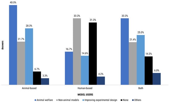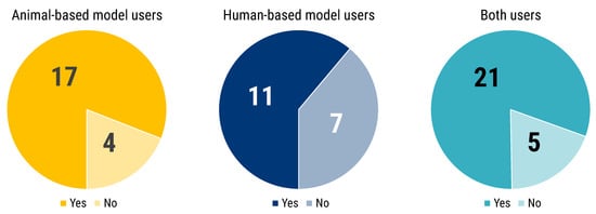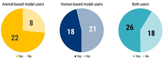 Users of animal-based models were more strongly convinced of the necessity of complementing experiments (73.3% vs. 26.7%), and a similar, albeit less marked trend was evident for users of both animal- and human-based models (59.1% vs. 40.9%). Human-based model users are the only group with a majority convinced of the absence of such necessity (53.8% vs. 46.2%) (Figure 5).