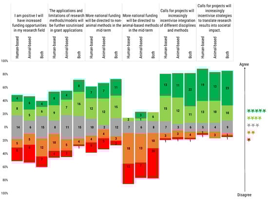 Participants were asked to rate a series of statements regarding funding opportunities. Rating scale was from 1 (red) to 5 (green) stars. Histogram dimensions are represented as 100%, where 100% is the total number of participants of each subgroup: human-based (39), animal-based (30) and both (44) model users. The stacked chart, calibrated around the neutral score (3 stars), shows the number of respondents based on their degree of agreement and segmented by researchers’ use of animal- or human-based or both models.