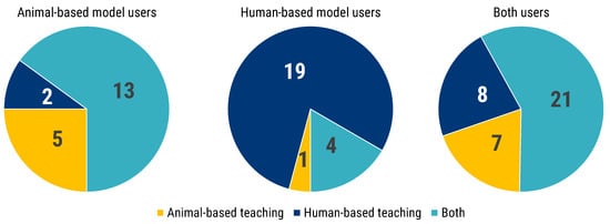 Participants answered the following question “In your teaching activity, are you mostly presenting human or animal experimental works ?”. The pie charts show the number of respondents answering regarding their teaching of experimental work. Each pie represents the answers for each group of researchers (animal-based, human-based or both models users).