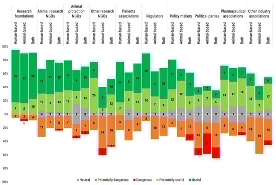 As previously stated, the dialogue on biomedical research is growing in participation, and in consequence. For this reason, the opinion of health and life sciences researchers regarding the participation of several stakeholders in the science policy discussion carries significant interest. Despite some differences, all three user groups (human, animal, both) had a common view on all the stakeholders, with a positive outlook on almost all of them, suggesting the respondents hold a positive view of this enlarged participation. Of note, all the three groups also agreed on considering as dangerous only a specific stakeholder group, political parties. This is in itself a surprising result, which might merit further investigation in itself, considering the weight political parties carry in translating societal calls into policy.