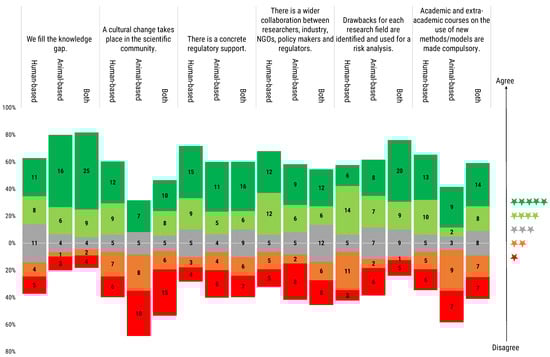 Regarding the need of a cultural change to take place in the scientific community, answers were less homogeneous: animal-based model users were the least convinced, with the majority of them (60.0%) disagreeing. Users of both animal- and human-based models, and of human models, were more positive in this regard. However, in both cases, significant disagreement was recorded (53.8% positive vs. 33.3% negative for the users of human-based models, and a slight inversion, 40.9% positive vs. 47.7% negative for the users of both types of model) (Figure 12).
