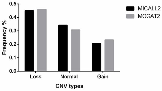 2.4. MICALL2 and MOGAT2 CNV and Tissue Expression Analyses