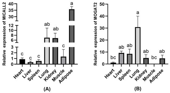 MICALL2 and MOGAT2 expression in Ashidan yak tissue samples. (A) MICALL2 and (B) MOGAT2 expression levels in different tissues. a–c denote significant differences at p < 0.05.