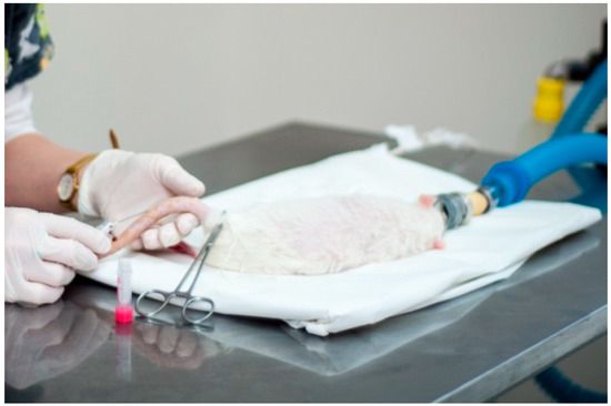 On presentation, the rat was bright and alert, the body weight was 321 g, and there had been a slow weight loss observed over the last few weeks. The body condition score (BCS) was evaluated as 3/5. The patient had mild dyspnea, slightly worsening upon stress, but approximately the same as in over the last months. The respiratory sounds over the lungs were found to be abnormal. The rat showed signs of paraparesis. Muscle loss and reduced muscle tone in the hind limbs were noticed with impaired proprioception and decreased flexor reflex; however, nociception was present. A full blood exam was performed. Whole blood was taken from the lateral tail vein in an amount of 0.8 mL under isoflurane (Isotek, Laboratorios Karizoo, Barcelona, Spain) anesthesia—5% for induction in a chamber and 2% afterwards for maintenance via facemask (Figure 1). All parameters, besides glucose at 20.88 mg/dL, appeared to be within the range limits (Table 1).