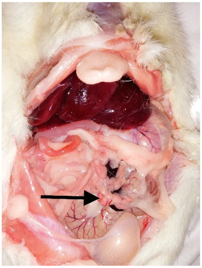 Postmortem image of the abdominal cavity of the rat. The arrow indicates a mass within the pancreas.