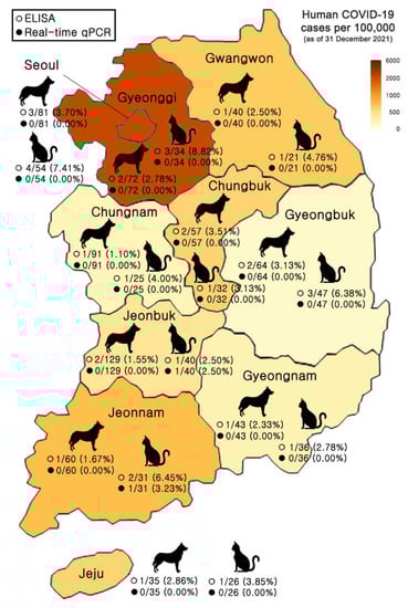 Distribution of dog and cat samples tested with real-time qPCR and ELISA across Korea. Data on human COVID-19 cases from the Ministry of Health and Welfare, 31 December 2021, and population data from the Ministry of the Interior and Safety, January 2020.