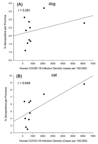 Correlation of percentage of seropositive dogs (A) and cats (B) per province and human COVID-19 infection in Korea.