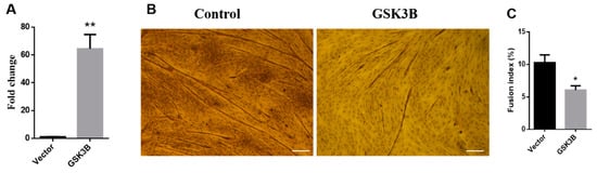 Previous studies have demonstrated that skeletal muscle GSK3β knockout mice have increased myonuclear proliferation in their regeneration of skeletal muscle [33]. GSK3β can be phosphorylated through PI3-K/Akt in response to the insulin signaling pathway before decreasing the transcription factor FOXO1 activity, thereby affecting mitogenesis in C2C12 cells [34]. Meanwhile, the GSK3β gene is inactivated by the PI3K/Akt pathway, which increased the expression of muscle cell differentiation marker genes and promoted muscle cell differentiation [16,35]. An inhibition of GSK3β can activate the β-Catenin-TCF complex to promote human muscle progenitor differentiation, which is necessary for their cellular differentiation [36]. Previous studies have reported a significant enrichment of MyoD on day 2 of sheep SMSCs differentiation, while MyoG appeared significantly enriched after day 4 of differentiation [37]. In this study, the overexpression of GSK3β decreased the expression of MyoD, MyoG, MyHC1, and MyHC2a genes in sheep SMSCs after day 4 of differentiation. These results indicate that GSK3β negatively regulates myogenic gene expression and may play a regulatory role after day 4 of differentiation.