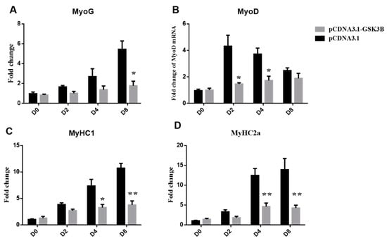 Moreover, GSK3β overexpression strongly decreased the myogenic differentiation of sheep skeletal muscle satellite cells (Figure 1B). GSK3β inhibited myotube formation, and the fusion index was significantly decreased at 8 days of differentiation compared with the control (p < 0.05) (Figure 1C). GSK3β overexpression significantly decreased expression levels of MyoG at 8 days of differentiation (p < 0.05) (Figure 2A). In addition, GSK3β overexpression robustly impaired expression of the MyoD gene at 2 and 4 days of differentiation (p < 0.05) (Figure 2B). Additionally, expression levels of MyHC1 and MyHC2a were significantly decreased at 4 and 8 days of differentiation (p < 0.01) during sheep SMSCs differentiation. (Figure 2C,D). These results suggest that an overexpression of GSK3β can inhibit the differentiation and key myogenic gene expression of sheep SMSCs.