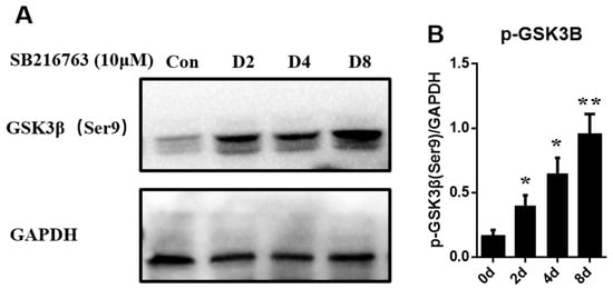 SB216763 is an effective small molecule inhibitor and belongs to maleimide. It can promote the phosphorylation of GSK3β ser9 to inhibit the activity of GSK3β. We identified the role of SB216763 in the regulation of the phosphorylation levels of sheep GSK3β. As shown in Figure 3, SB216763 treatment had a time-course effect on the phosphorylation levels of sheep GSK3β. After the SB216763 treatment, the phosphorylation levels of sheep GSK3β were significantly upregulated (p < 0.05) at 2 days and reached the highest level at 8 days of differentiation (p < 0.01). These results suggest that SB216763 increases the phosphorylation of GSK3β during sheep SMSCs differentiation.