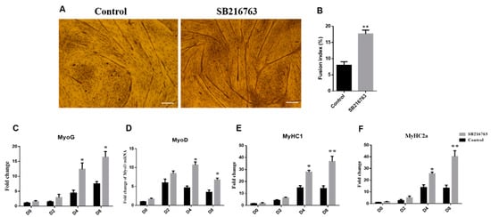 To evaluate the role of time-course SB216763 in the regulation of mRNA expression patterns of GSK3β, when 90% confluence was observed, muscle satellite cells were serum starved for 6 h, then 10 μM SB216763 was added for 0, 2, 4, and 8 days during myogenic differentiation.