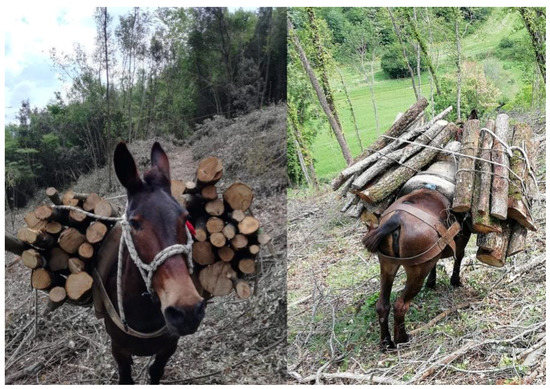Working mules carrying wood. The use of an appropriate harness can easily avoid the occurrence of skin lesions due to wood weight.