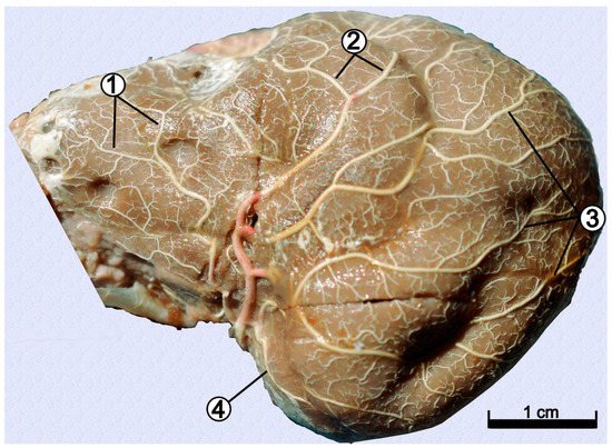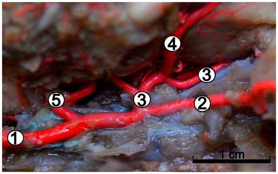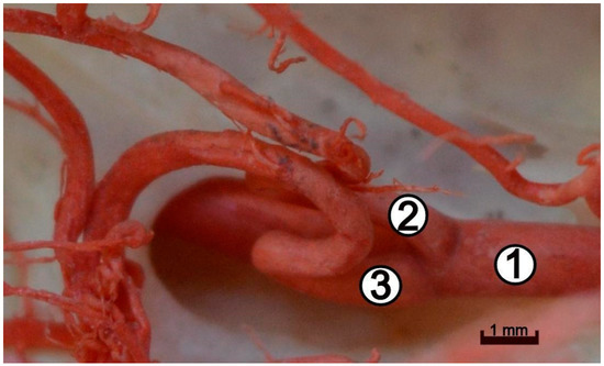 The vessels branching off from the arterial circle of the brain show some characteristics of the analyzed species. In the red-necked wallaby, it was confirmed that four main branches branched off from the middle cerebral artery. Skoczylas et al. [37] found three main branches in the polar fox, which he named the rostral middle cerebral artery, dorsal middle cerebral artery, and the caudal middle cerebral artery. The domestic pig and wild boar have shown significant variations in the branching off the vessels from the middle cerebral artery. In some individuals, the division of the middle cerebral artery occurred in the dorsally located point, while in others there was found a double middle cerebral artery [38,39]. The dorsal temporal branch was the strongest in the sheep, polar fox, and silver fox [21,37,40].