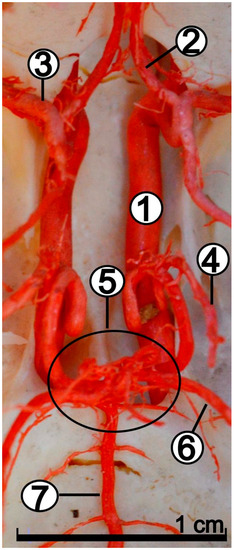 Dorsal view of the arterial circle of the brain. Vessels in the cranial cavity on the skeletal scaffold. Corrosion cast. 1—internal carotid artery; 2—rostral cerebral artery; 3—middle cerebral artery; 4—caudal cerebral artery; 5—caudal communicating artery; 6—rostral cerebellar artery; 7—basilar artery.
