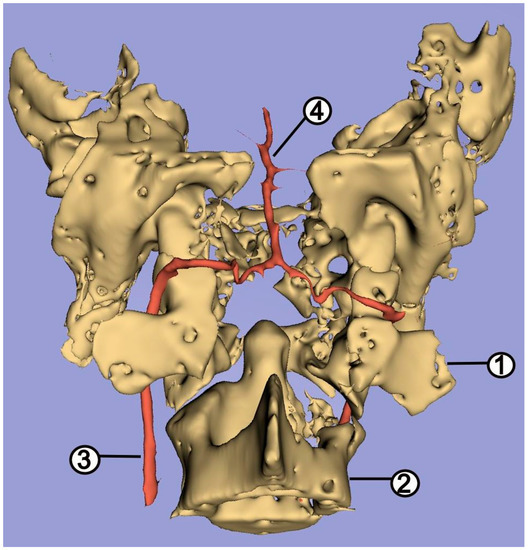 Two cadavers of both genders were used for angio-CT examination. Before the scans, the bilateral common carotid arteries were injected with barium sulphate (barium sulfuricum 1.0 g/mL, Medana, Sieradz, Poland). The heads were fixed motionless on the tomograph’s table. Cone-bean computed tomography (Fidex Animage, Pleasanton, CA, USA) was performed at the University Centre for Veterinary Medicine in Poznan, Poland, with scanning parameters of 110 kVp, 0.08 mAs pet shot, 20.48 mAs (Total mAs), and a reconstructed slice thickness of 0.29 mm. After the examination scan was reconstructed, the 3D model was created using public available software 3D Slicer (version 5.0.3). All of the excess tissue, except for bone tissue and arteries, was cut out, digitally. The bone tissue and arteries were digitally colored—yellow for bone and red for arteries.