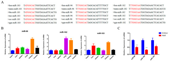 The expression characteristics of the miR-183/96/182 cluster in cattle. (A) Conservative analysis of the mature sequence of the miR-183/96/182cluster among different species. The red letters show the miRNA seed sequence. (B) The expression feature of the miR-183-96-182 cluster in different tissues of fetal cattle. (C) The expression level of the miR-183/96/182 cluster in fetal and adult bovine muscle tissues. Data are presented as the means ± SEM. * p < 0.05 and *** p < 0.001.