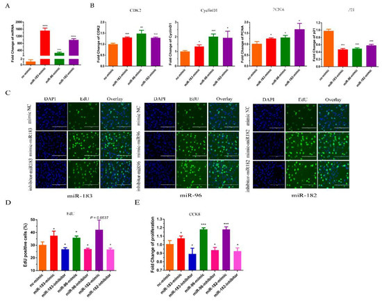 The miR-183/96/182 cluster promotes bovine myoblast proliferation. (A) The detection of expression efficiency after the transfection of miR-183/96/182 cluster mimics. (B) The expression levels of the cell proliferation genes CyclinD1, PCNA, CDK2 and P21 mRNA were detected by RT-qPCR. (C,D) EdU-positive cells were detected after transfection of the miR-183/96/182 cluster mimics and inhibitors. (E) Proliferation in bovine myoblasts was performed by the CCK-8 assay. Data are presented as the means ± SEM. * p < 0.05, ** p < 0.01, *** p < 0.001 and **** p < 0.0001.