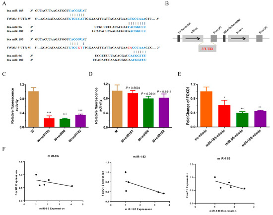 FoxO1 was the target of the miR-183/96/182 cluster. (A) The distribution of potential binding sites of the miR-183/96/182 cluster in the 3′UTR of FoxO1. The red letters indicate the certain mutated bases. (B) The illustration shows the construct of a dual-luciferase reporter system. (C,D) The luciferase activity of the FoxO1 (wild or mutant) psi-check2 reporter vector was detected after co-transfection of the miR-183/96/182 cluster mimics in HEK293T cells. (E) The mRNA of FoxO1 were detected by RT-qPCR after transfection of the miR-183/96/182 cluster mimics and inhibitors. (F) The correlation analysis on the expression of FoxO1 and the miR-183/96/182 cluster during myoblast differentiation. Data are presented as the means ± SEM. * p < 0.05, ** p < 0.01 and *** p < 0.001.