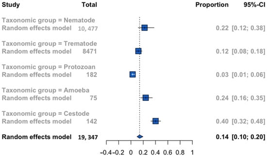 Since the analyzed studies were conducted across different environmental conditions, procedures of sample collection and diagnostic methods, the prevalence of zoonotic parasites was expected to show high heterogeneity. Heterogeneity was explored by inspection of a forest plot, estimation of between-study random-effects variance (t2) and the percentage of variability explained by heterogeneity rather than by a simple variance (I2 index) []. The between-study variance (t2) was estimated using the maximum-likelihood estimator method. We investigated sources of heterogeneity between studies through subgroup analysis with respect to continent and country from which the study was conducted, genus of the host, parasite taxonomic group, sample origin, and type of diagnostic test. The results are presented as summary proportions with 95% confidence intervals and were displayed in a forest plot as well as heterogeneity between subgroups.