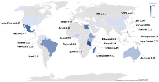 Geographical distribution in data assessment showed prevalence in 22 countries (Figure 3), where Africa (eight countries) showed the highest clustered prevalence rate (0.28; 95% CI: 0.20–0.37). Egypt and other sub-Saharan African countries maintain high tilapia production []; unfortunately, many African countries face constant challenges, such as lack of safe drinking water, inadequate sanitation, and hygiene, as well as diagnosis and treatment of disease difficulties []. These factors could enhance the dispersion and transmission of zoonotic parasites in the consumption of tilapia and other fish species. Asia has extensive tilapia production capacity in countries, such as China [,], which also depicts a high endemism of zoonotic parasites in the south-east of the continent []. According to our results, Asia presented a low clustered prevalence rate (0.10; 95% CI: 0.04–0.18), which shows a lack of attention to public health problems by some countries in the area. The United States Agency for International Development (USAID) has participated through mass medication against tropical diseases on the Asian continent []. In addition, water, hygiene, and sanitation programs have been implemented [].