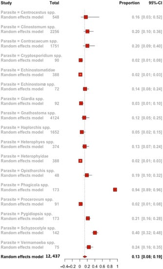 Among parasitic genera, the highest grouped prevalence rates in tilapia populations were cestode Schyzocotyle spp. (0.40; 95% CI: 0.32–0.48). These parasites usually infect a wide fish variety, however, in humans, there are reports of accidental infection by egg stage, where signology is manifested with abdominal pain []. Our study suggests that emerging infections affect tilapia populations largely because the fish have not been previously exposed to these pathogens, so they lack regulation in the expression of genes related to the adaptive immune system necessary to combat these infections [,]. Moreover, infections by reoffending genera showed lower prevalence, reflecting host-parasite relationship coevolution, where both have been exposed to antagonistic natural selection processes, allowing the ecological relationship continuity []. Clinostomum spp. is an example. This parasite presented 2256 observations and has the lowest pooled prevalence rates (0.20; 95% CI: 0.10–0.36) because this etiological agent has been described with high specificity of infection in tilapia []. The forest plot of the explanatory variable “Parasite” shows this behavior (Figure 4).