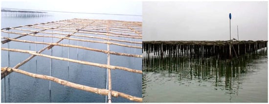 Concerning bivalve farming in Greece, Thermaikos Gulf is the culture site with the highest productivity of mussels, representing 90% of the total mussel production, while 80% is exported to other European countries [50]. However, in 2020 and 2021, reinforced by the COVID-19 pandemic situation that delayed harvesting, mass mortality events in Greek mussels farms resulted in the collapse of productivity, reaching 100% loss of the production in northern Greece’s farms. Mortalities began with the rise of the temperature and eventually killed the total of the population when surface sea water temperature reached 30 °C in the hanging park “bouchot type” culture, a traditional culture technique, similar to the French bouchot culture as well as to raft culture (Figure 1), with the modification that the vertical poles are embedded in the shallow waters (up to 1.5–2 m) of the Axios River Delta (north Greece). This technique provides the advantage to the farmers of controlling the mussel sleeves more easily and using smaller boats than in the modern longline technique that utilizes floats and needs larger boats, but at the same time mussels are more vulnerable to abiotic factors due to the shallow waters.