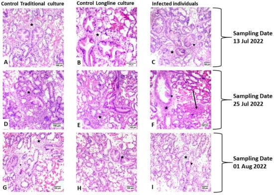 Histological display of sampled M. galloprovincialis individuals. (A–C) represent samples from the first sampling (13 July 2022), (D–F) represent samples from the second sampling (25 July 2022) and (G–I) are from the third sampling (1 August 2022). Regardless of the culture type or the health condition of the samples, all samples presented heavy hemocyte infiltration (star), while in samples infected with Marteilia refringens nodular type exhibited inflammation (arrow) and epithelial tissue degeneration (arrowhead) [H&E staining (×20 Objective)].