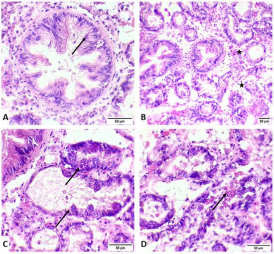 The histopathological examination documented the presence of developmental stages and mature stages in epithelium of digestive glands of M. galloprovincialis. Atrophic development was documented in the epithelium of digestive glands in samples infected with Marteilia refringens (Figure 3 and Figure 4). Initial stages (nurse cells-arrow) of M. refringens sporulation were detected in the epithelium of digestive tubules (Figure 3A), while mature stages were detected in the epithelial cells of digestive glands (Figure 3B). Atrophic epithelium along with damage in the epithelium indicates the release of sporangia from the lumen of digestive tubules (Figure 3C,D). Strong hemocytic (star) infiltration was observed in all samples regardless of M. refringens infection, although inflammation was observed in samples infected with M. refringens. The presence of the pathogen in the histopathologically positive samples was confirmed by molecular examination, which was identified as Marteilia refringens after BLAST searches of the derived sequences, exhibiting 100% similarity with other 18S SSU rRNA M. refrigens haplotypes hosting M. galloprovincialis and Ostrea edulis available in the GenBank database.
