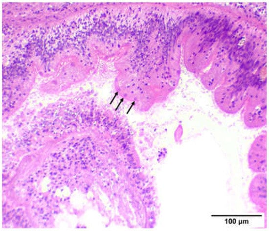 Young stages of M. refringens (arrows) within the epithelium of M. galloprovincialis digestive tract. H&E staining (×20 Objective).