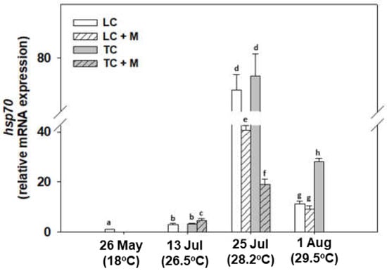 A generally increasing pattern was observed in hsp70 gene expression, the levels of which increased in all samplings compared with the one in May. Specifically, the 25 July exhibited the highest values. While only on 1 August was TC statistically higher than LC, in general, samples infected by Martelia spp.exhibited lower hsp70 expression levels compared with non-infected individuals (Figure 6).