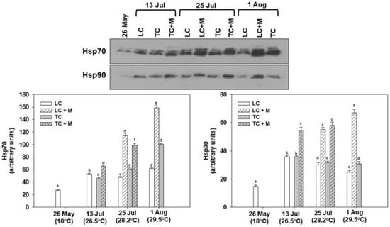 Hsp70 and Hsp90 induction levels followed a similar pattern to that of the hsp70 gene expression regarding levels compared with the sampling from May. Specifically, samplings on 13 and 25 July and 1 August exhibited statistically significant increases in both Hsp70 and Hsp90 compared with May. Non-infected individuals exhibited higher Hsp70 levels in August and higher Hsp90 levels on 13 July. Regarding the different culture techniques, while Hsp90 exhibited no significant differences, interestingly, TC Hsp 70 levels were increased compared with LC in the 25 July and 1 August samplings. Both proteins however, exhibited statistically significant increased levels in Martelia spp.-infected individuals compared with non-infected at all sampling points (Figure 7).