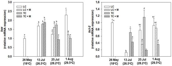 On the other hand, bcl-2 gene expression exhibited the same or lower levels compared with the sampling from May. The latter exhibits the effect of thermal stress on the suppression of the anti-apoptotic bcl-2 gene expression. While in both July samplings, TC was significantly higher compared to LC, interestingly, an opposite pattern was observed on 1 August. Similar to bax gene expression, Martelia-positive individuals exhibited the same or lower levels of bcl-2 gene expression compared with non-infected individuals (Figure 8).