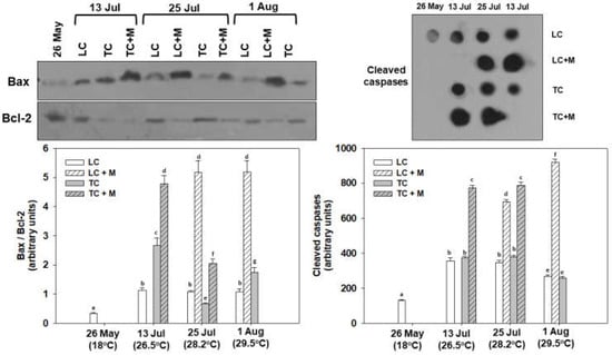 Bax/Bcl-2 ratios and cleaved caspase levels in the mantle of M. galloprovincialis specimens, either infected by Martelia spp. (M) or not. Samples were collected from Thermaikos Gulf during a summer heatwave both from traditional culture-Bouchot (TC) and long-line system (LC). Representative blots and dots are shown. Values represent means ± SD; n = 5 preparations from different animals. Lower case letters indicate statistically significant differences (p < 0.05) between samples. Original blots: Figures S2 and S3.