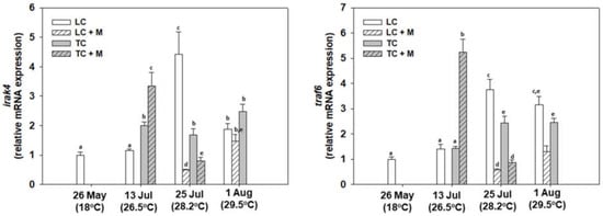 In general, irak4 gene expression levels increased in all samplings compared with May. Once again, the increase in these genes related to immunological processes during the heatwave underline that this phenomenon placed significant stress on the mussels. Regarding non-infected individuals, the heatwave differentially affected LC and TC. Individuals infected with Martelia spp. exhibited increased levels only on 13 July compared with non-infected individuals, while those on 25 July and 1 August exhibited the opposite pattern, which was also observed regarding the traf6 gene expression levels (Figure 8). Likewise, traf6 gene expression exhibited the same seasonal pattern of expression as that of irak4 (Figure 10).