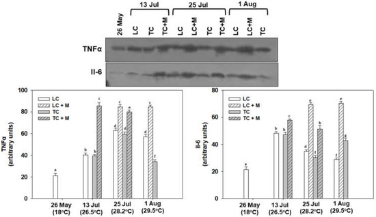 As expected, post-translational immunological indicators were also statistically increased during the heatwave. Specifically, TNFα levels exhibited statistically significantly increased levels at all sampling points compared with May, with the highest levels observed on 25 July. While no statistical differences were observed between LC and TC non-infected individuals on 13 and 25 July, on 1 August, LC was statistically higher than TC. All Martelia spp.-infected individuals exhibited increased TNFα and Il-6 levels compared with non-infected individuals (Figure 9). Il-6 levels exhibited statistically significant increased levels at all sampling points compared to May, with the highest levels observed on 13 July. While no statistical differences were observed between LC and TC non-infected individuals on 13 and 25 July, on 1 August TC was statistically higher than LC (Figure 11).