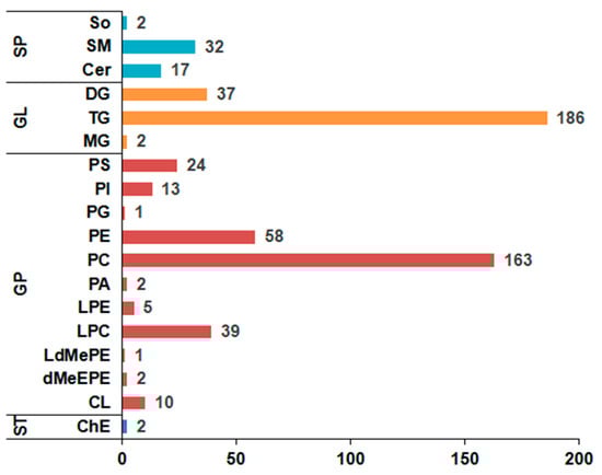 The column chart of the lipid classification in yak longissimus dorsi (LD). Column length represents the number of lipids. ST represents sterol lipid; SP represents sphingolipid; GL represents glycerolipid; GP represents glycerophospholipid; Cer represents ceramide; ChE represents cholesteryl ester; DG represents diglyceride; CL represents cardiolipin; dMeEPE represents dimethylphosphatidylethanolamine; LPC represents lyso-phosphatidylcholine; LdMePE represents lyso-dimethylphosphatidylethanolamine; LPE represents lyso-phosphatidylethanolamine; MG represents monoglyceride; PA represents phosphatidic acid; PC represents phosphatidylcholine; PE represents phosphatidylethanolamine; PG represents phosphatidylglycerol; PI represents phosphatidylinositol; PS represents phosphatidylserine; SM represents sphingomyelin; So represents sphingosine; TG represents triacylglycerol.