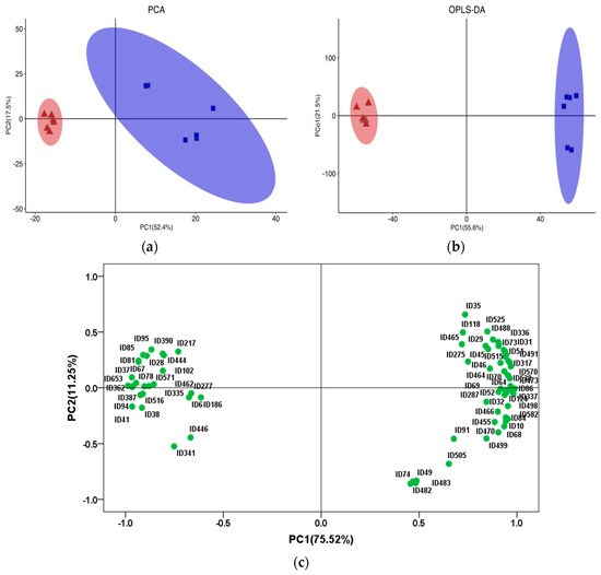 (a) The score plot of principal component analysis (PCA) of lipids in yak LD under graze feeding (GF) and stall feeding (SF). Red represents SF group; blue represents GF group. (b) The score plot of orthogonal partial least squares discriminant analysis (OPLS-DA) of lipids in yak LD under GF and SF. (c) Loading-PAC of significantly different lipids (SDLs) in the LD of GF and SF yaks. PC1 represents principal component 1, and PC2 represents principal component 2.