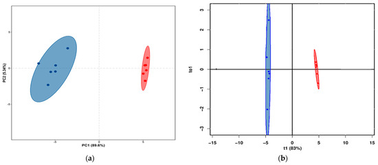 (a) The PCA score plot of volatile flavor compounds in yak LD under GF and SF. Different colors represent different groups. Blue represents the samples in the GF group, and red represents the samples in the SF group. (b) The result of OPLS-DA analysis of the volatile flavor compounds in yak LD under GF and SF. Blue represents the samples in the GF group, and red represents the samples in the SF group.