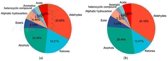 The volatile flavor compounds in yak LD were detected according to the method described in [33] with some modifications. Headspace solid-phase microextraction (HS-SPME) combined with QP 2010 GC-MS (Simadzu, Kyoto, Japan) coupled with a Thermo Scientific TRACE TR-FFAP capillary column (30 m × 0.25 mm, 0.25 μm; Waltham, MA, USA) was used for analyzing the volatile flavor compounds in yak LD. The yak LD sample was mashed with a BÜCHI Mixer B-400 homogenizer (Flawil, Switzerland), and then 5 g of the mashed sample was placed in a 20 mL headspace bottle. The bottle was put in a fridge at 4 °C. Before use, the extraction head (Supelco, Bellefonte, PA, USA) was held at 220 °C for 30 min in the GC inlet; then, it was inserted into the headspace bottle containing the mashed yak LD sample, and volatile flavor compounds were extracted at 80 °C for 10 min. At last, the volatile flavor compounds were desorbed from the extraction head in the GC inlet for 5 min. The GC conditions were as follows: the carrier gas was high-purity helium (He) and the flow rate was 1 mL/min; the programmed temperature in the column oven was the initial temperature 40 °C, 5 min, 4 °C/min to 120 °C, 10 min, then 13 °C/min to 220 °C, holding for 5 min; the inlet temperature was 220 °C; and the split injection ratio was 20:1. MS conditions were as follows: the transmission line temperature was 220 °C; ion source temperature was 200 °C; ionization mode was electron impact ionization, and ionization voltage was 70 eV; scanning mode was full scan, and scan range was m/z 35–500. The MS data obtained with GC-MS were compared with the NIST online databases, and only compounds with both positive and negative similarity index > 750 were chosen and analyzed. Volatile flavor compounds were confirmed by the qualitative analysis. The relative content of each volatile flavor compound was calculated by the area normalization method. These volatile flavor compounds were classified as aldehydes, ketones, alcohols, esters, aliphatic hydrocarbons, heterocyclic compounds, aromatics and acids. The total content of aldehydes, ketones, alcohols, esters, aliphatic hydrocarbons, heterocyclic compounds, aromatics and acids was the sum of all volatile flavor compounds’ content in each category, respectively.