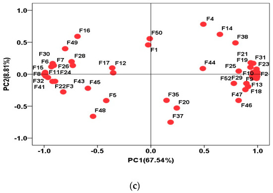 The main volatile flavor compounds in both GF and SF groups were pelargonic aldehyde, 3-hydroxy-2-butanone and 1-octen-3-ol. The composition of various volatile flavor compounds in the yak LD under GF and SF is shown in Figure 4a,b, respectively. The highest content in both GF and SF groups was aldehydes, followed by alcohols and ketones in sequence. The total contents of aldehydes, alcohols and esters in SF group were higher than the values in the GF group (p < 0.05), whereas ketones, heterocyclic compounds and acids were lower (p < 0.05). The Loading-PAC of volatile flavor compounds in yak LD is shown in Figure 4c. The variance contribution rates of PC1 and PC2 were 67.54% and 8.81%, respectively, and the aggregate value was 76.35%. The compounds 1-heptanol (F27), vinyl acetate (F34), acetophenone (F21), 2-heptanone (F19), 3-hydroxy-2-butanone (F18), 1-octanol (F29), 1-pentanol (F24), ethyl caprate (F32), pentylcyclopropane (F41), pelargonic aldehyde (F6) and 1-octen-3-ol (F30) played an important role in the flavor differences between SF and GF yak LD from the angle of PC1; heptaldehyde (F4) and 2,2,4,4,6,8,8-heptamethylnonane (F37) played an important role in the flavor differences between SF and GF yak LD from the angle of PC2.
