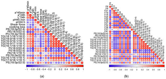 The correlations of crucial lipids with meat quality and volatile flavor compounds are shown in Figure 5a,b. Shear force was negatively correlated with the concentrations of TG(16:1/16:1/18:1), TG(16:1/18:1/18:1), TG(16:0/17:1/18:1) and TG(16:0/16:1/18:1); the cooking loss was positively correlated with the concentration of PE(18:0/22:5); a*45min and a*24h were highly positively correlated with the concentrations of PE(18:0/22:4), PC(18:2/18:0), whereas they were negatively correlated with the concentration of PE(18:0/22:5); L*24h was highly positively correlated with the concentrations of PE(18:0/22:4), PC(18:2/18:0), TG(18:1/18:1/18:2), TG(18:0/18:1/18:1), TG(16:0/16:1/18:1), TG(16:0/17:1/18:1) and TG(16:1/18:1/18:1). On the other hand, total content of aldehydes was highly positively correlated with the concentrations of PC(18:2/18:0), TG(16:1/16:1/18:1) and TG(16:0/16:1/18:1); the total content of ketones was highly positively correlated with the concentrations of PE(18:0/22:5), PI(18:0/20:4), PI(18:0/22:5) and PC(18:2/18:0); and the total content of alcohols was highly positively correlated with the concentrations of TG(16:1/18:1/18:1), PE(18:0/22:4), PC(18:2/18:0), TG(16:0/16:1/18:1) and TG(16:1/16:1/18:1).