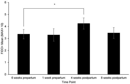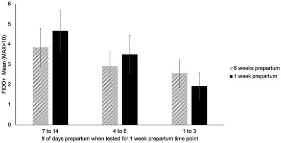 Mean FIDO+ score at 6-weeks and 1 week prepartum separated by number of days prepartum when tested at the 1 week prepartum time point.