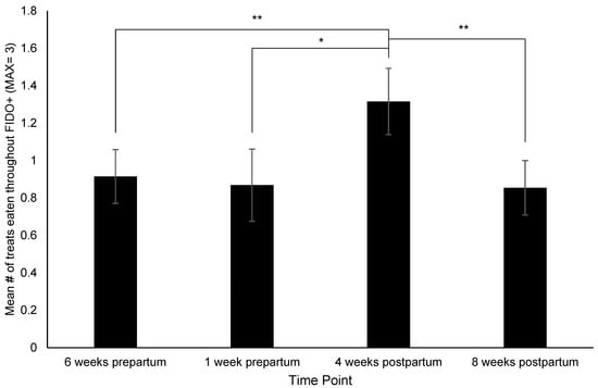 Change in treat consumption throughout the Field Instantaneous Dog Observation Tool + (FIDO+) across time points. Sample sizes for each time point were n = 59, n = 38, n = 57, and n = 55, respectively. Error bars represent SE. * indicates p ≤ 0.05, ** indicates p < 0.01.