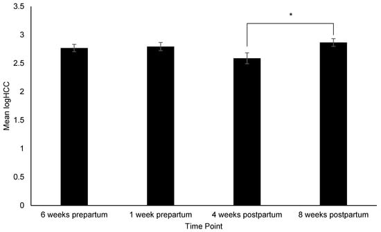 Change in hair cortisol concentration (logHCC) across time points. Sample sizes for each time point were n = 59, n = 43, n = 41, and n = 53, respectively. Error bars represent SE. * indicates p ≤ 0.05.
