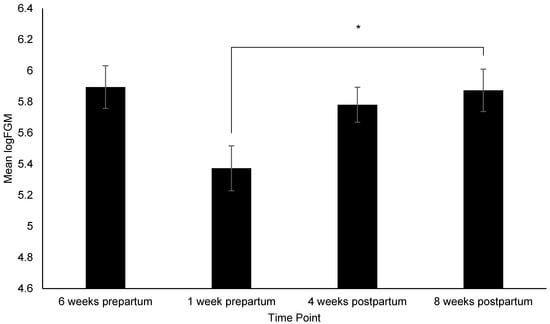 Change in fecal glucocorticoid metabolites (logFGM) across time points. Sample sizes for each time point were n = 34, n = 37, n = 53, and n = 52, respectively. Error bars represent SE. * indicates p ≤ 0.05.