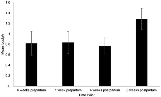Change in fecal secretory immunoglobulin A (logsIgA) across time points. Sample sizes for each time point were n = 34, n = 37, n = 53, and n = 51, respectively. Error bars represent SE.