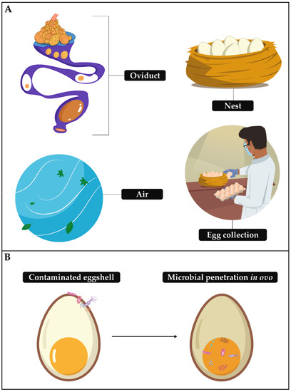 The eggshell is a physical, physiological and immunological protective surface that morphologically and functionally regulates the health of the embryo and supports its development through structural impermeability to pathogens and the expression of proteins that mobilize an antimicrobial response to pathogens [14,15]. Disturbances in antimicrobial functions of the shell by effects on its structure, as well as the resistance and motile capacity of some microorganisms [15,16,17,18] and exposure time of the shell to the microorganism [19,20], are possible causes of horizontal transmission of pathogens (shell–embryo) (Figure 1B), inducing infectious and inflammatory processes. Pathogens such as Escherichia coli, Klebsiella, Micrococcus, Proteus, Pseudomonas, Staphylococcus spp. and Salmonella Enteritidis may be associated with egg penetration and embryonic mortality [17,21,22,23]. The sanitation process on the farm is continuously controlled to avoid this burden on embryonic health, chick fatality and eggshell contamination by fungal and bacterial organisms. The latter can be favored by the microclimate on farms and hatcheries [24] and persists from pre-lay to pre-hatch (Figure 1A) [25].