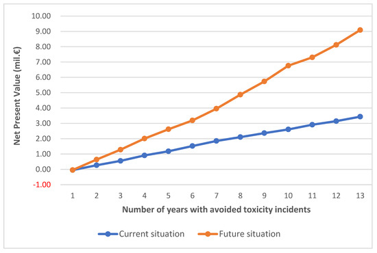 Based on the results of the LP model, the CBA of the investment was performed, and the results are reported in Figure 2. Apparently, as the number of years with avoided toxicity incidences increases, the NPV of the investment increases as well. The “Future” scenario performs much better than “Current”; however, the slope of the NPV curve in “Future” is much steeper, indicating that each incident avoided has a much more significant impact compared to “Current”. It is very important to notice that the NPV of the investment is positive even if only one incident is avoided. This demonstrates the importance of the system for the operation and sustainability of the mussel farming system in the area.